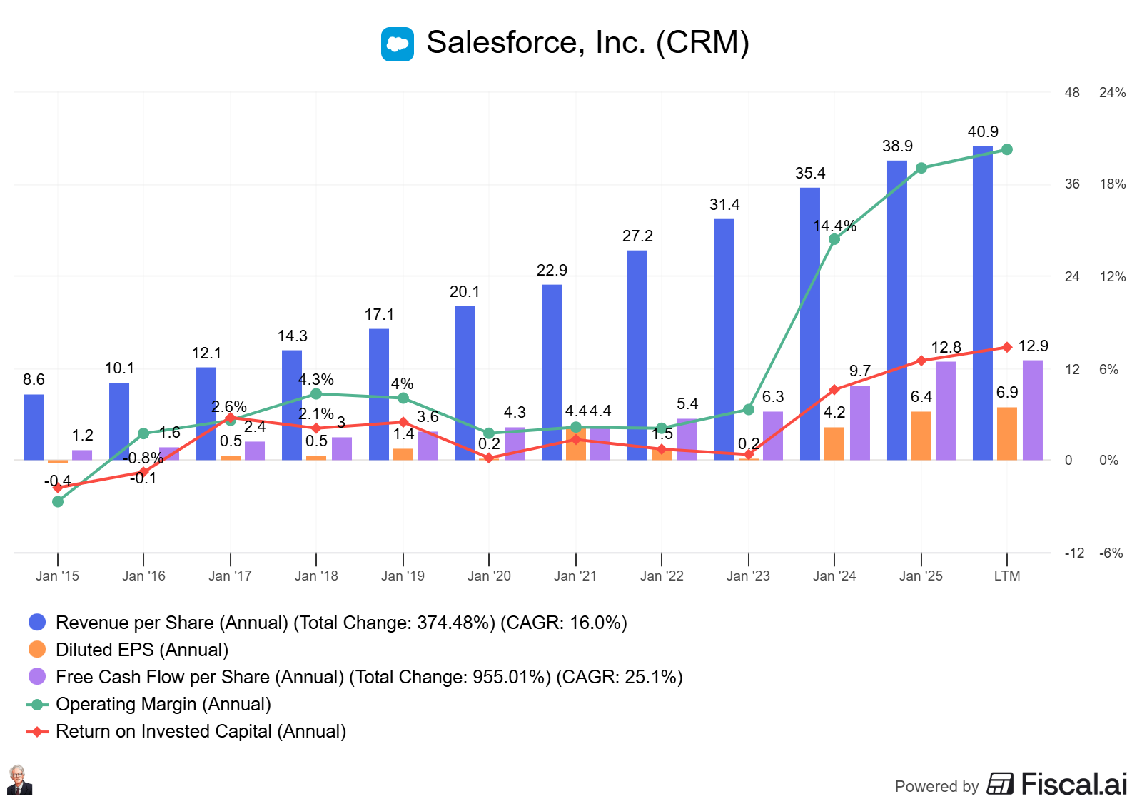 Note: Salesforce’s ROIC is low due to its massive acquisitions.