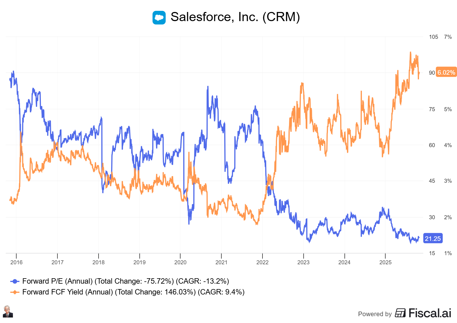 Forward PE is down from ~90x to 21x. FCF yield from ~2.5% to 6%.