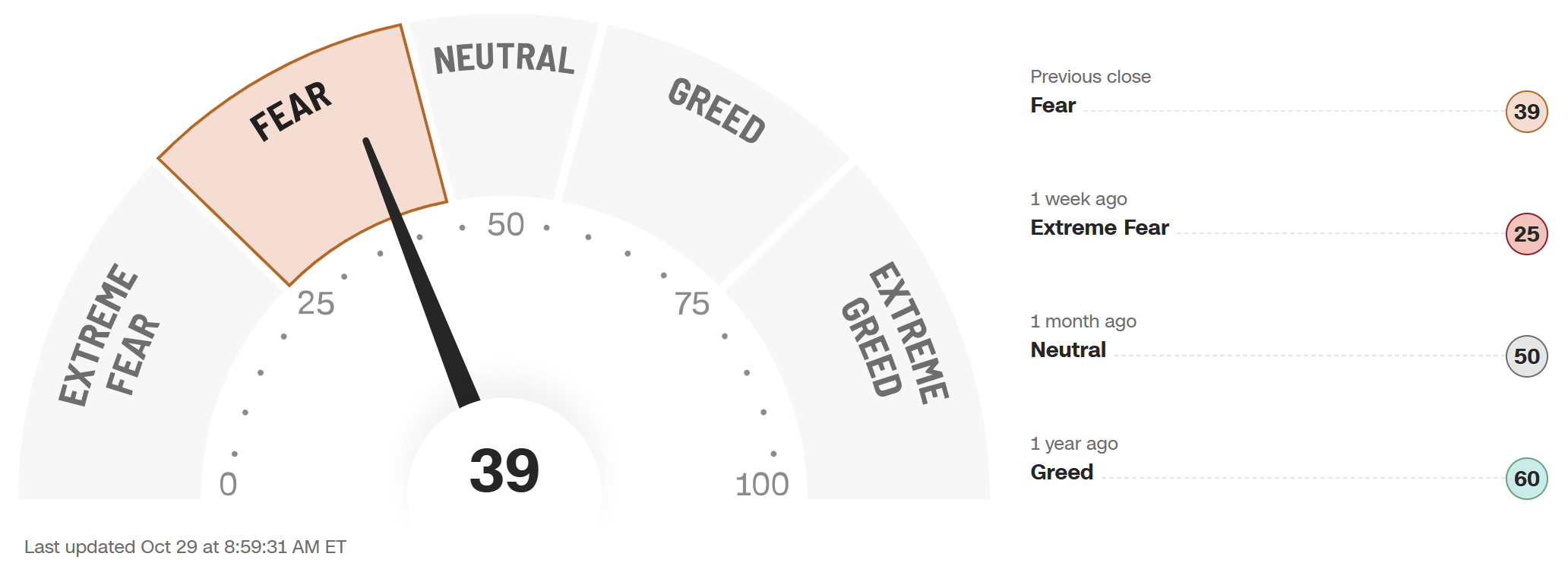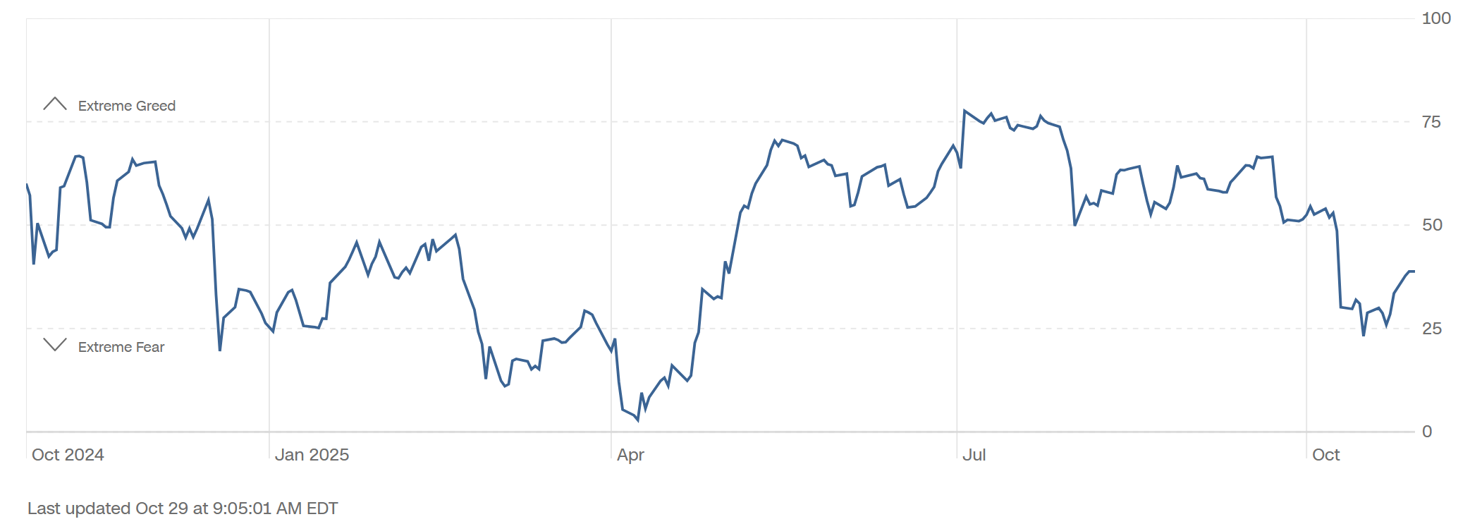 Investor sentiment has cooled from Greed to fear. The market is not panicking, but it is no longer in “euphoria”-mode.