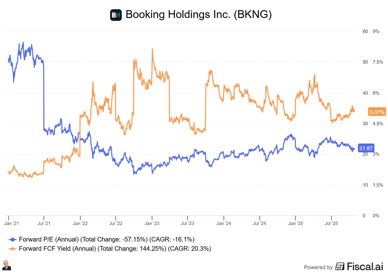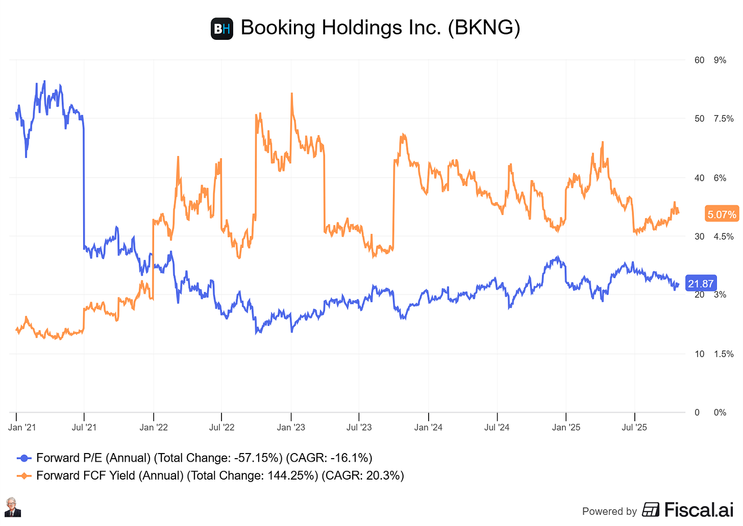 Booking is trading at a fair valuation based on its forward PE and FCF yield: