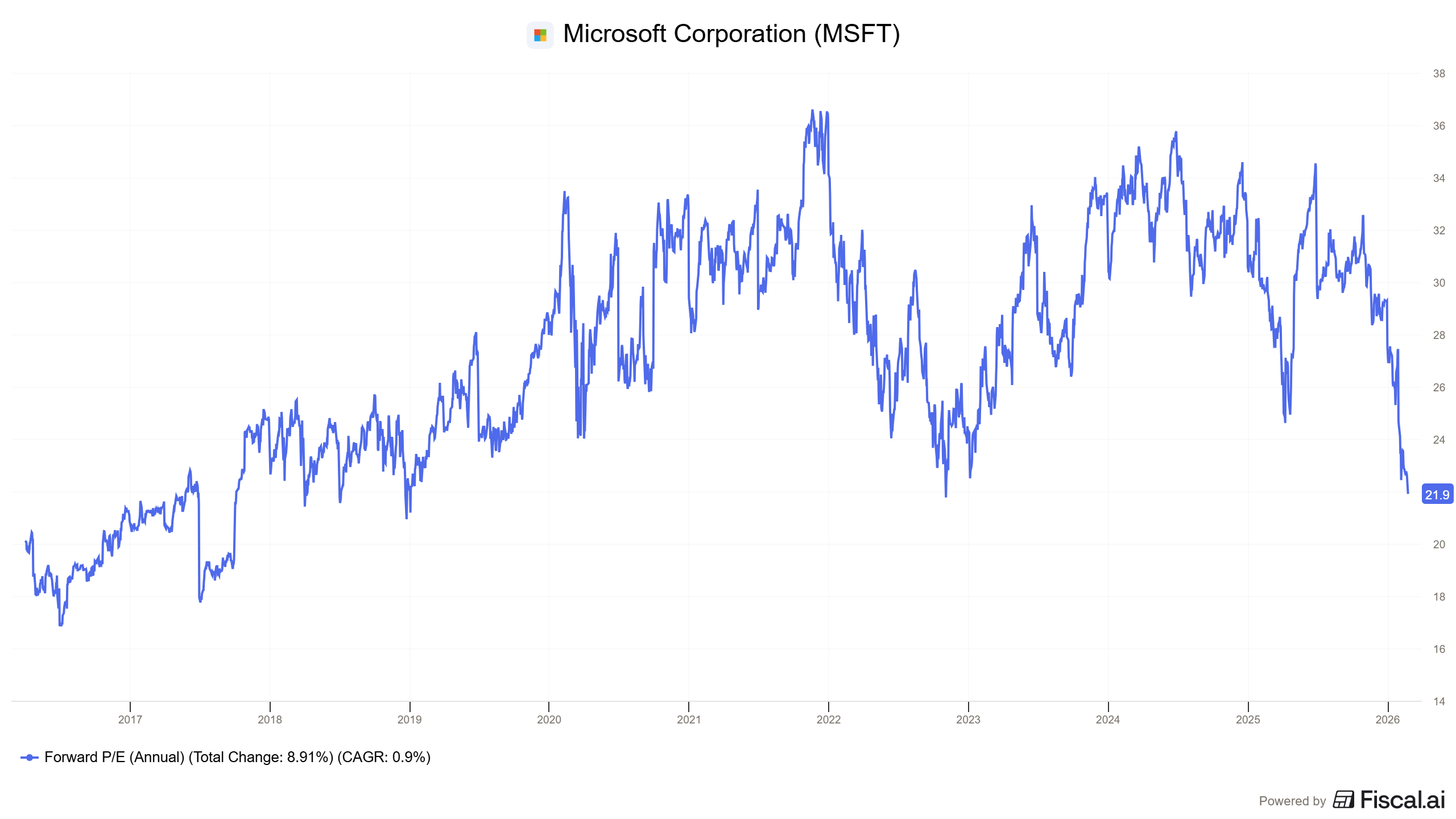 The fact of the matter is that Microsoft is a pristine quality business, growing at unheard of levels for its size, now trading at 21.9x forward earnings: