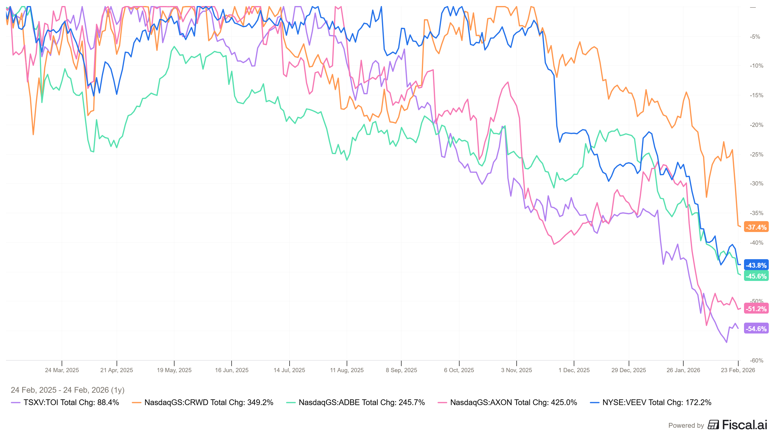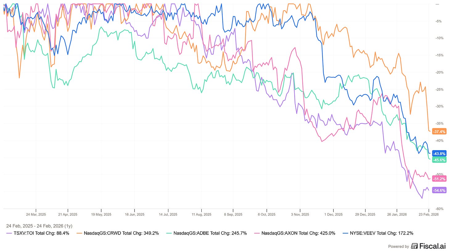 Fast growing strong businesses like Crowdstrike and Axon are down -37.4% and -51.2% respectively. And community darlings like Topicus is down -54.6% from its all time highs.