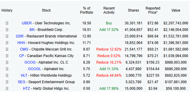 Bill Ackman made bold moves this quarter, adding 18.50% to Uber, from not existing in the portfolio, to the #1 position. In addition, he continues to add to Brookfield, while reducing in Alphabet (net), Chipotle Mexican Grill, and Hilton Worldwide.