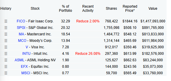 Trimming Fair Isaac by 2% to 32.29% of the portfolio.