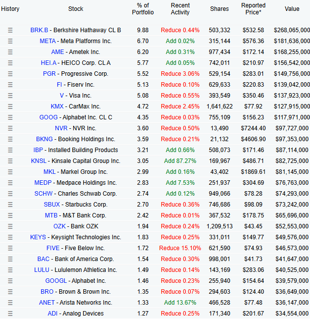 Massive add of +87.27% to his Kinsale Capital position, now 3.05% of the portfolio.