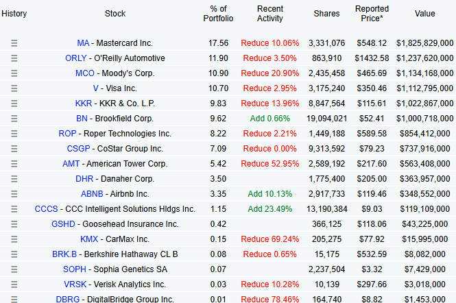 Akre Capital notably sold a lot of their core holdings this quarter, among them Mastercard, Moody’s, and KKR. The only adds were rather small, indicating that investors might be pulling out capital from the fund. The only notable purchase this quarter was Airbnb with a 10.13% add.