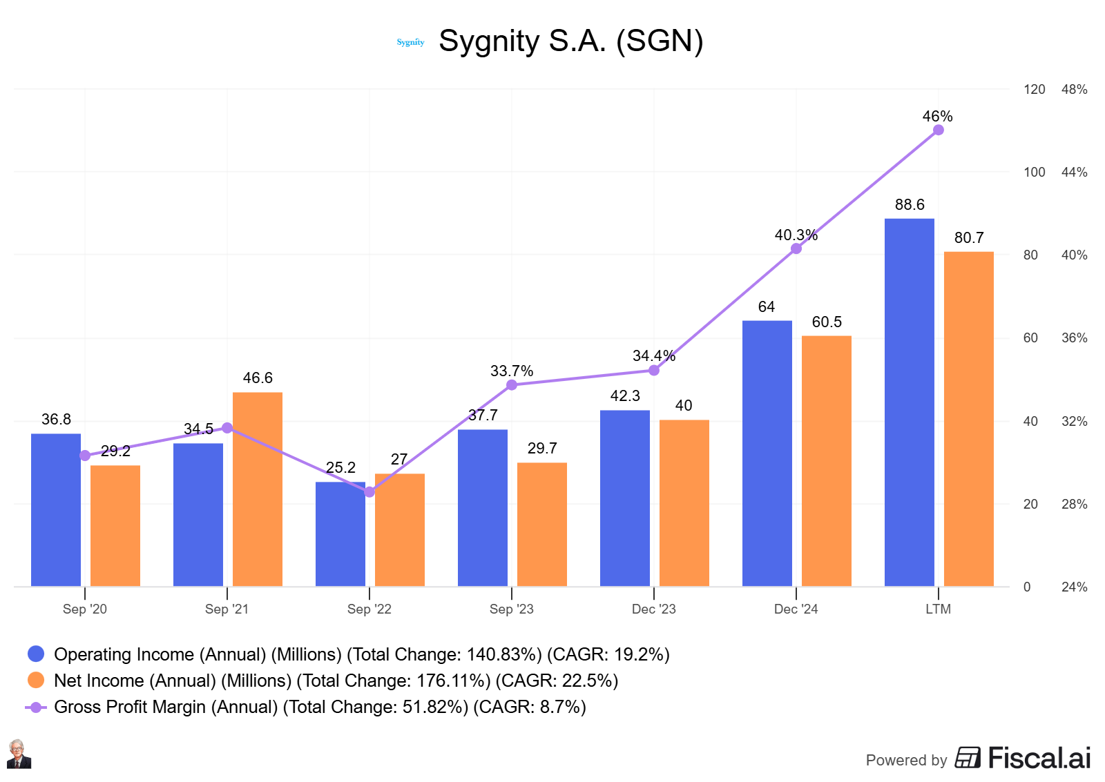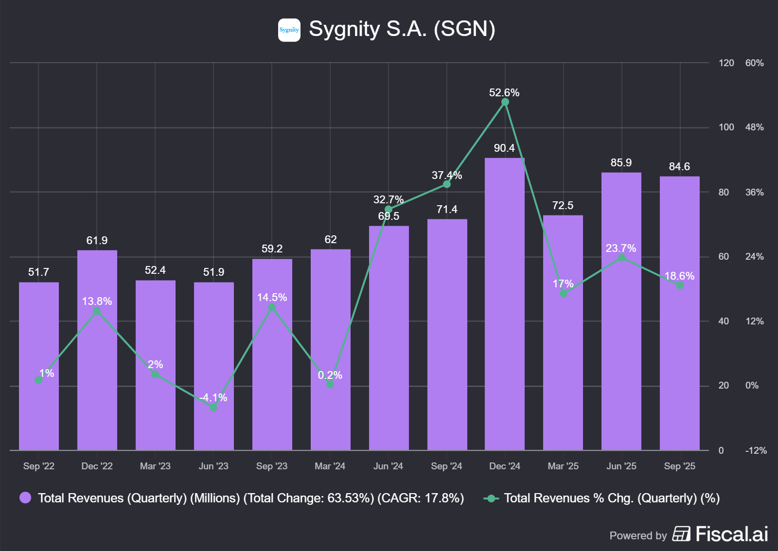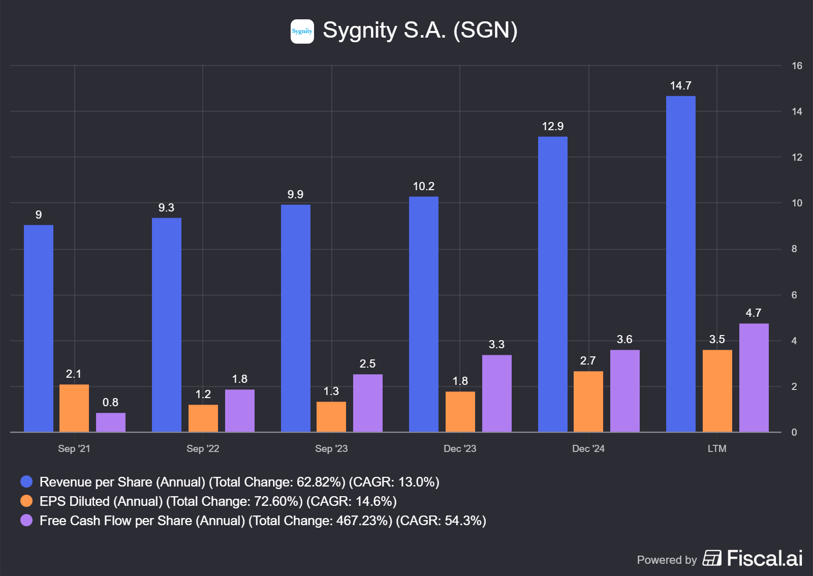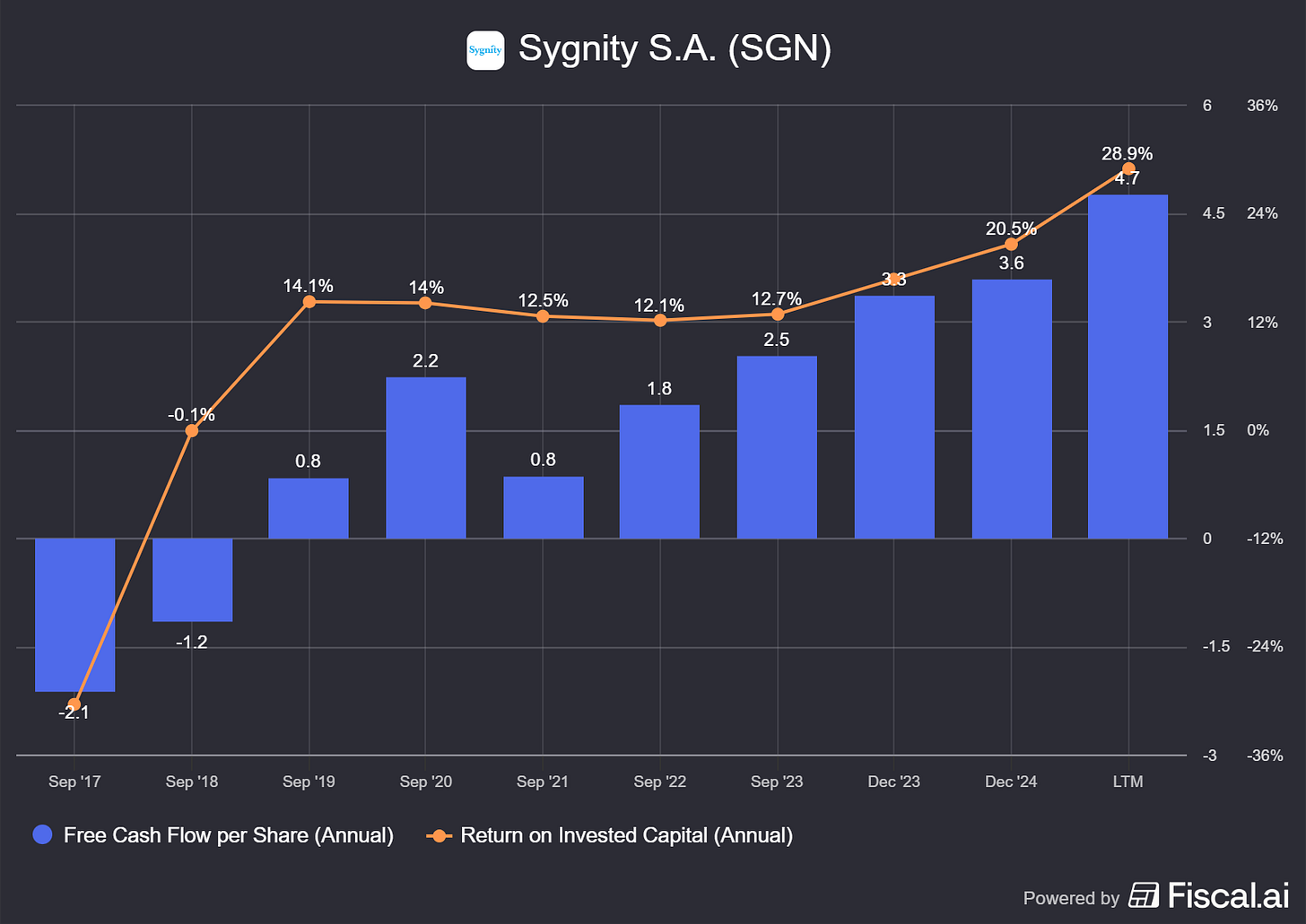 For a quality-growth investor, this matters more than pure top-line: Sygnity is not just growing. It is compounding free cash flow per zloty of revenue, which is exactly what you want to see in a Constellation-style business, as they will use the free cash to acquire more sticky vertical software businesses to continue to compound.