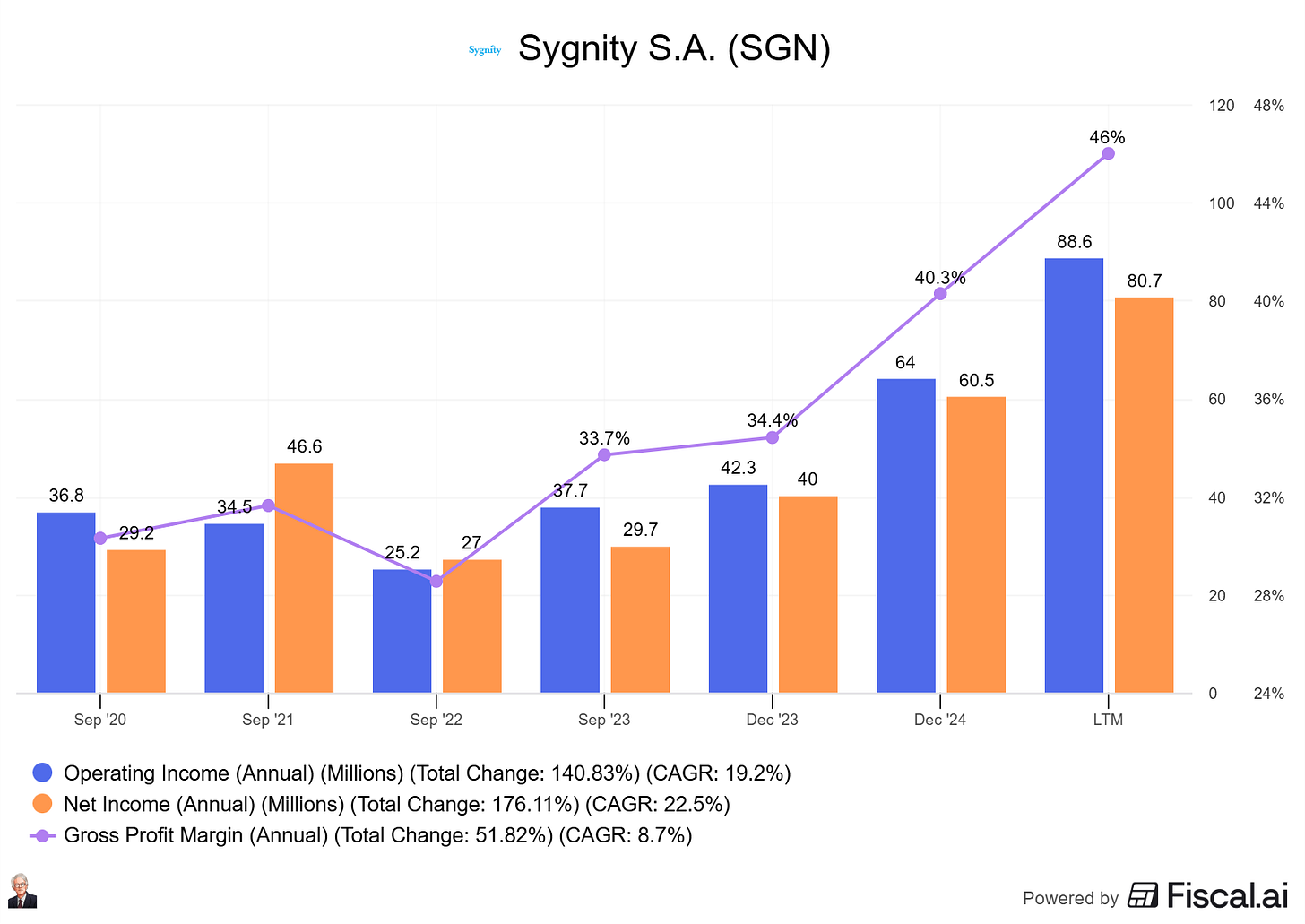 Gross margins have significantly improved since their lows of 28.5% in 2021; in the TTM, gross margins have expanded to 46%. This showcases Sygnity’s successful pivot into higher-quality revenue sources by applying the CSI/TSS acquisition playbook.