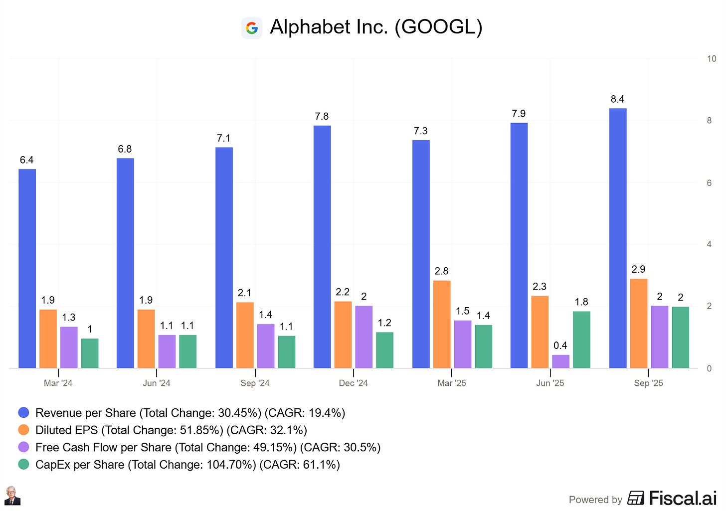 Capex per share +61.1% (This one will eat away the free cash flows in the coming quarters as Alphabet is ramping up its investments alongside the other big tech names).