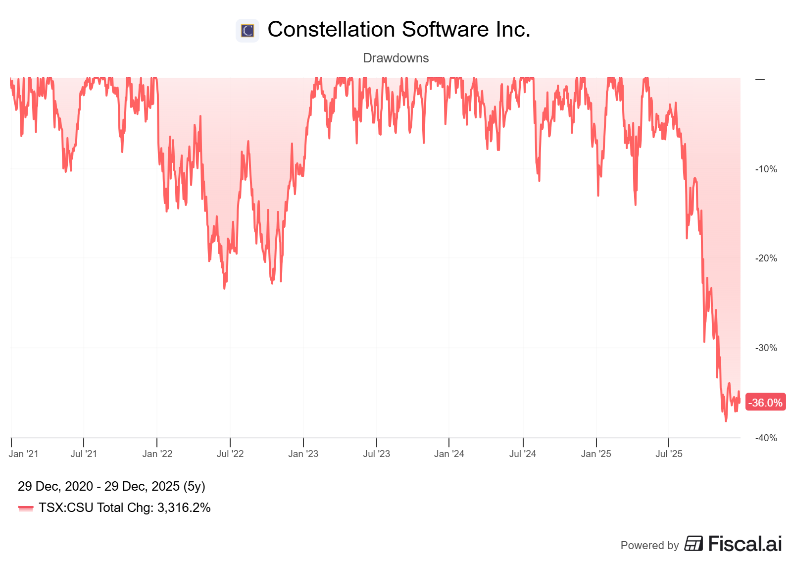Constellation Software almost never sells off, but in 2025, it experienced a meaningful pullback from its all-time highs of -36%.