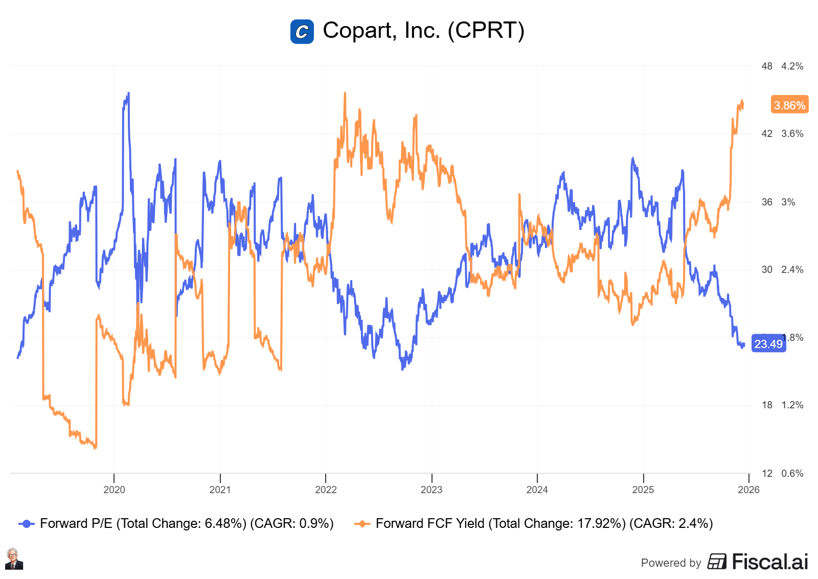 Copart trades at approximately 23.5x forward earnings and 3.86% Free Cash Flow yields, a premium to most industrial and auto-related businesses. However, the valuation reflects monopoly-like economics, high margins, and durable growth. Long-term returns are driven primarily by earnings growth rather than multiple expansion. That said, Copart is trading at a multi-year low from a multiples perspective.