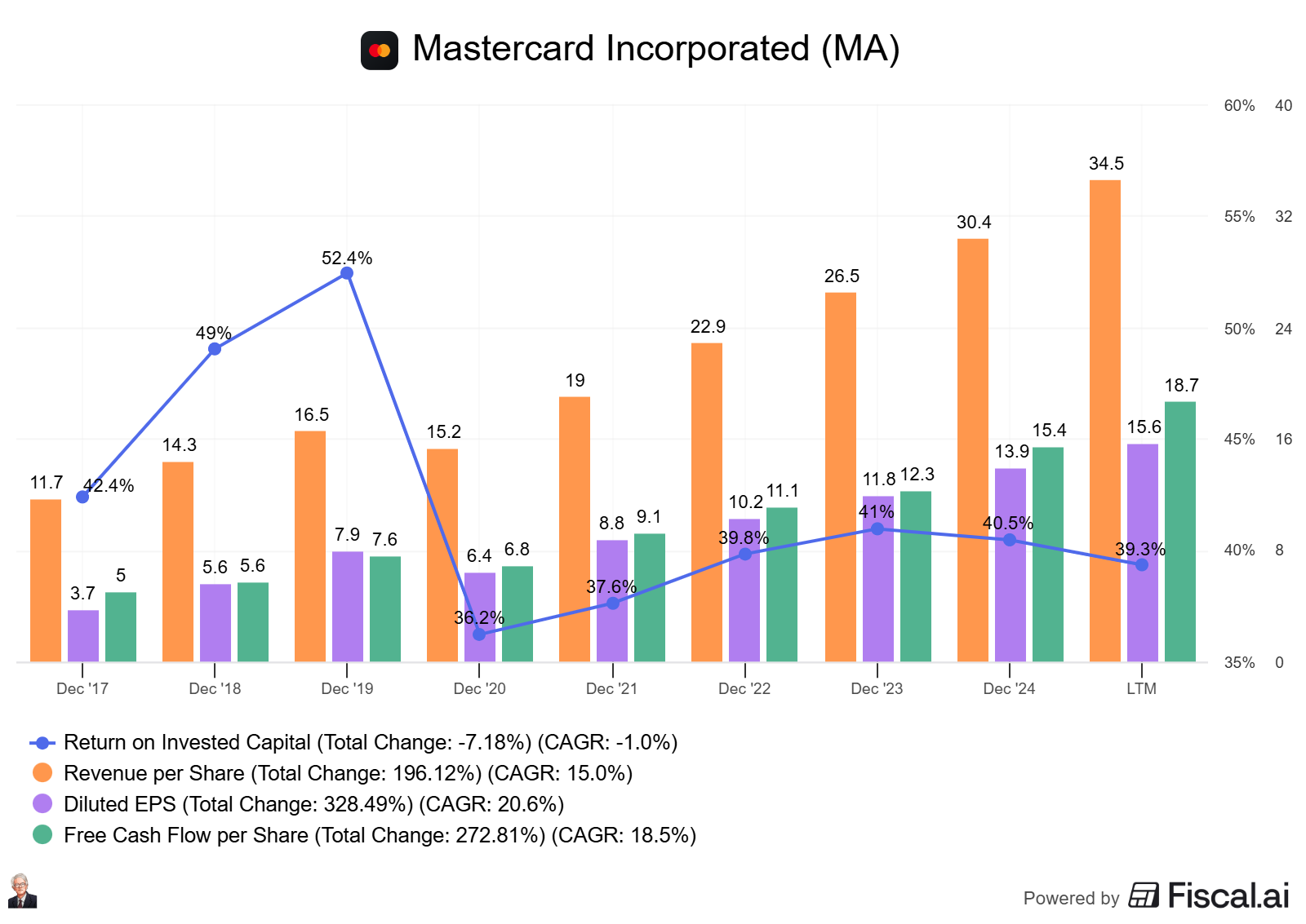 Mastercard typically trades at a premium multiple because the business offers rare qualities: durable growth, high margins, high ROIC, and low operational risk. The key driver of long-term returns is whether Mastercard can sustain mid-teens EPS growth through volume, pricing discipline, operating leverage, and continued services expansion. At the right entry points, it’s the kind of business you can hold for a decade and let compounding do the work.