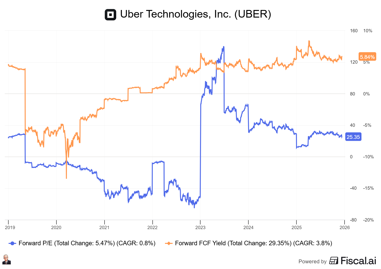 Uber trades at a multiple that reflects improving profitability rather than peak growth. The market is still discounting execution risk and competitive pressure, but if Uber sustains mid-teens free cash flow growth, valuation remains attractive relative to platform quality and its optionality.