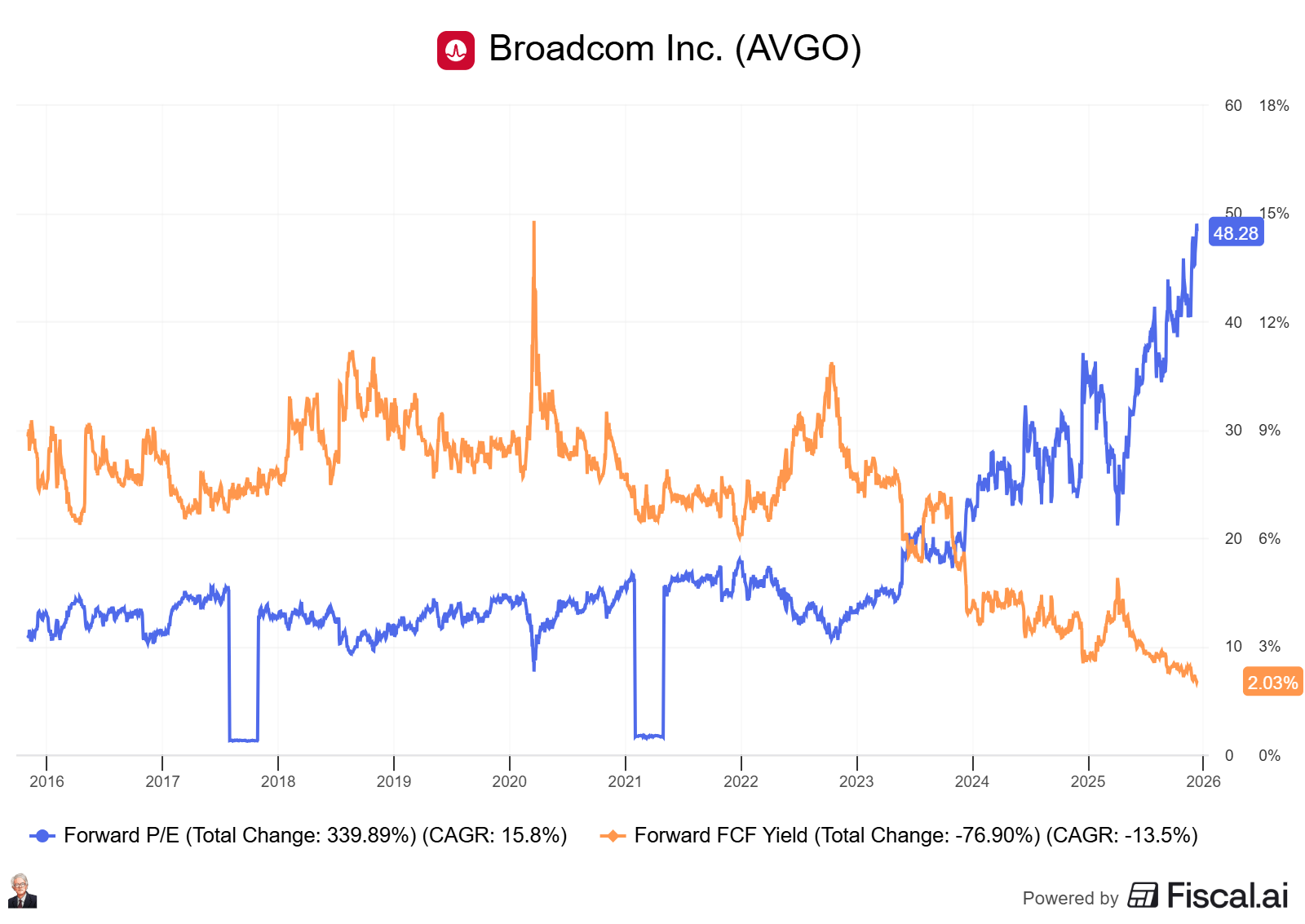 Broadcom trades at approximately 48x forward earnings, a premium to many peers. The market justifies the price due to Broadcom’s earnings durability, AI exposure, and its sustained high capital returns. Free cash flow yield is currently 2.03%. A high price for a business that is well-positioned in the AI race.