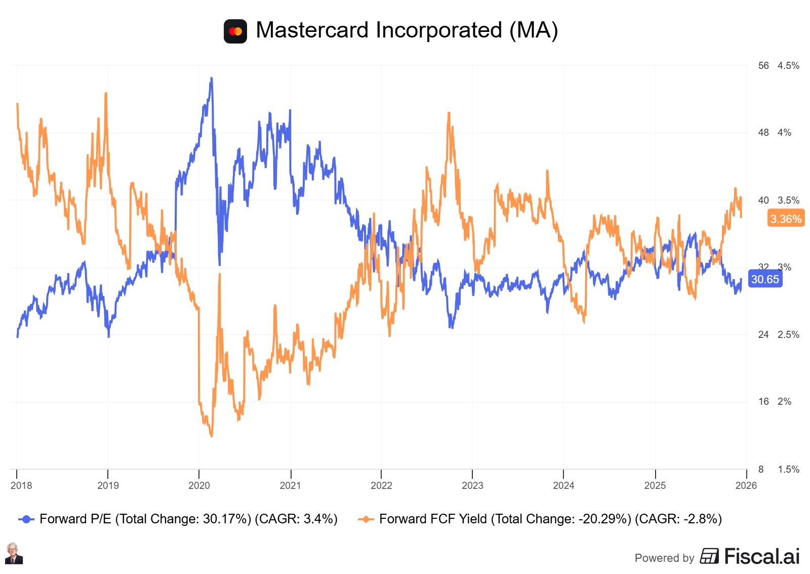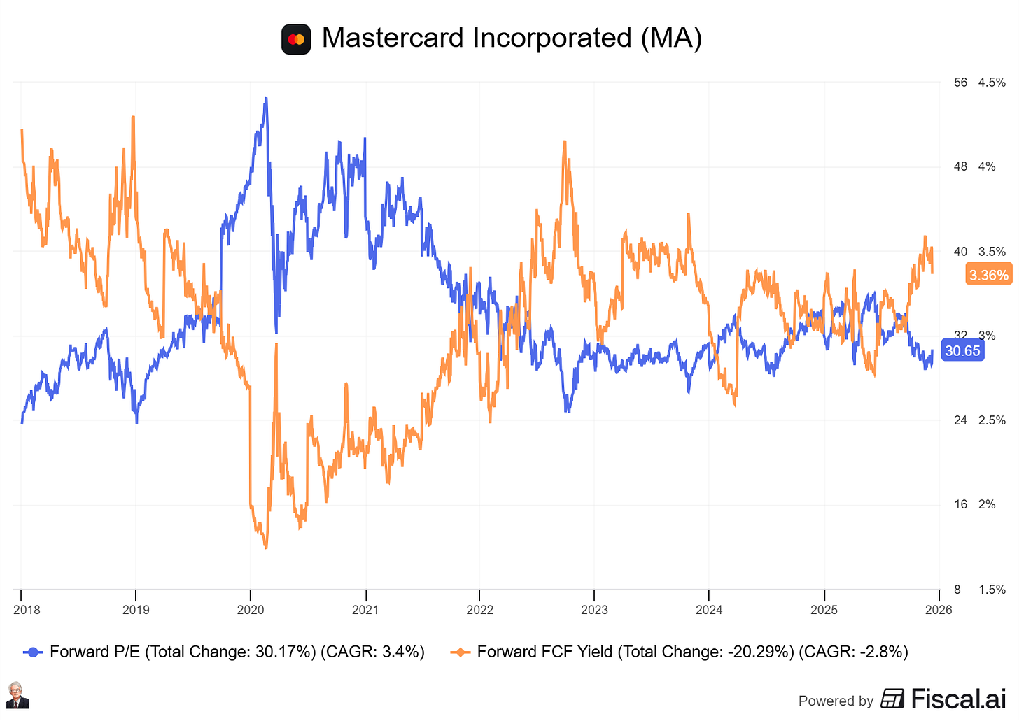 Similar to Visa, Mastercard is trading at a historically decent valuation of 30x forward PE and 3.36% FCF yield.