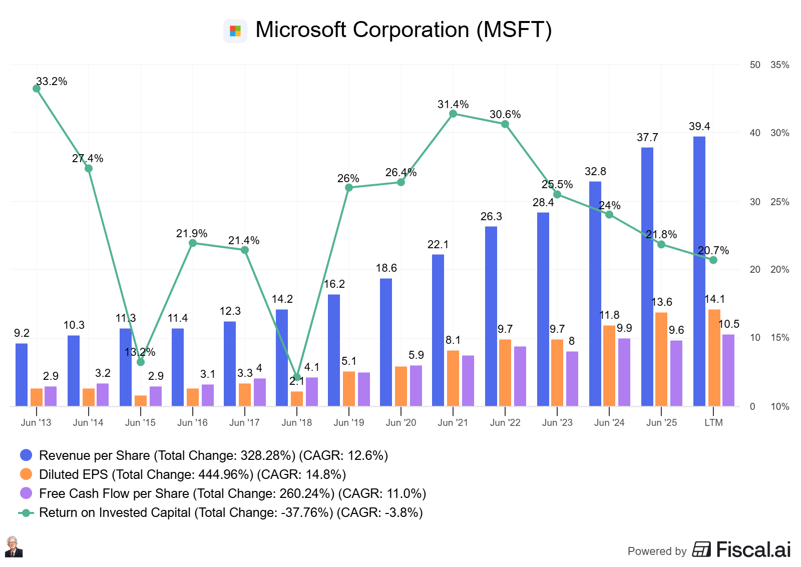 Microsoft compounds through a blend of steady top-line growth and expanding monetization per customer. Azure remains the primary growth engine, while Microsoft 365 and security continue to deliver highly predictable recurring revenue.