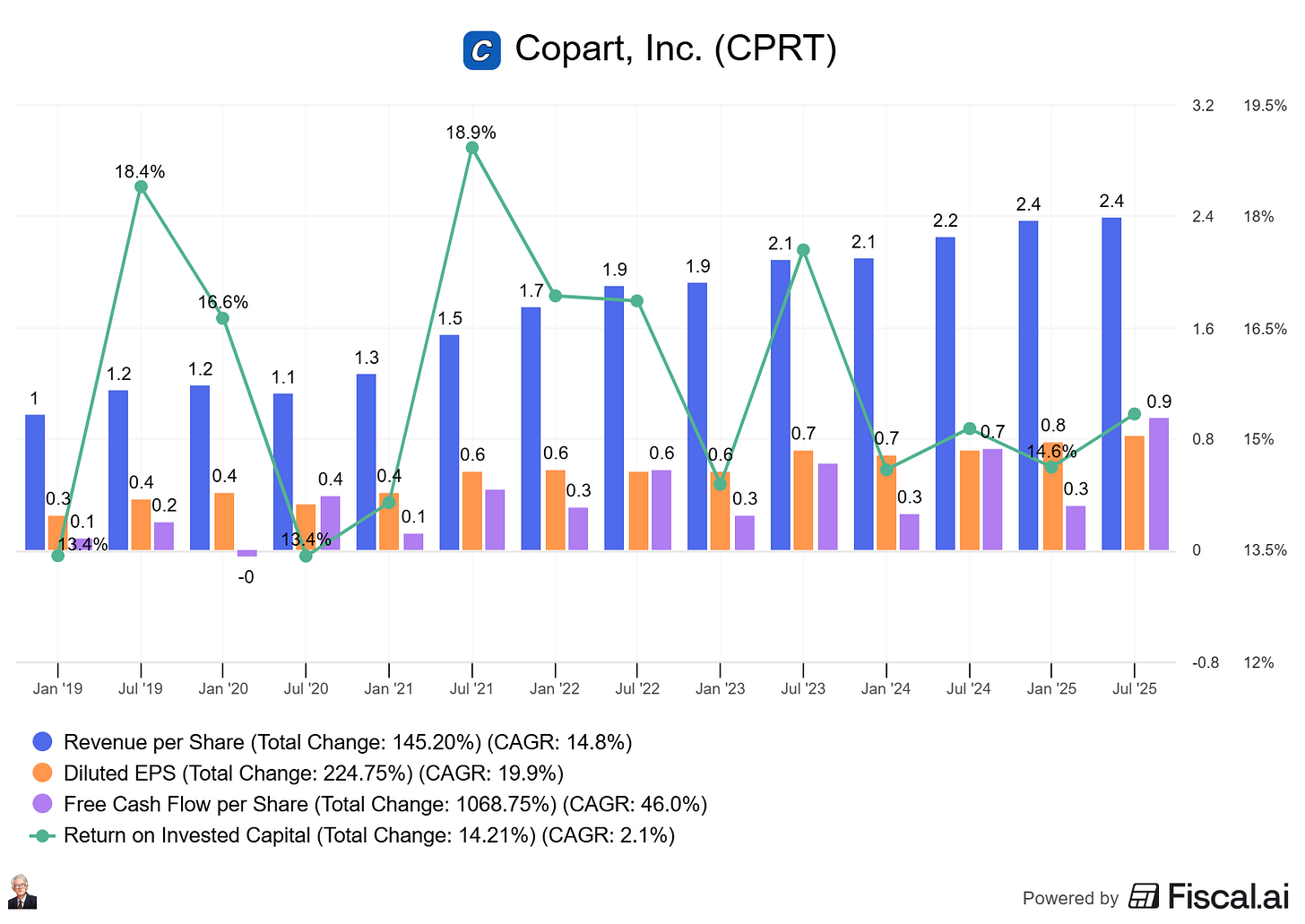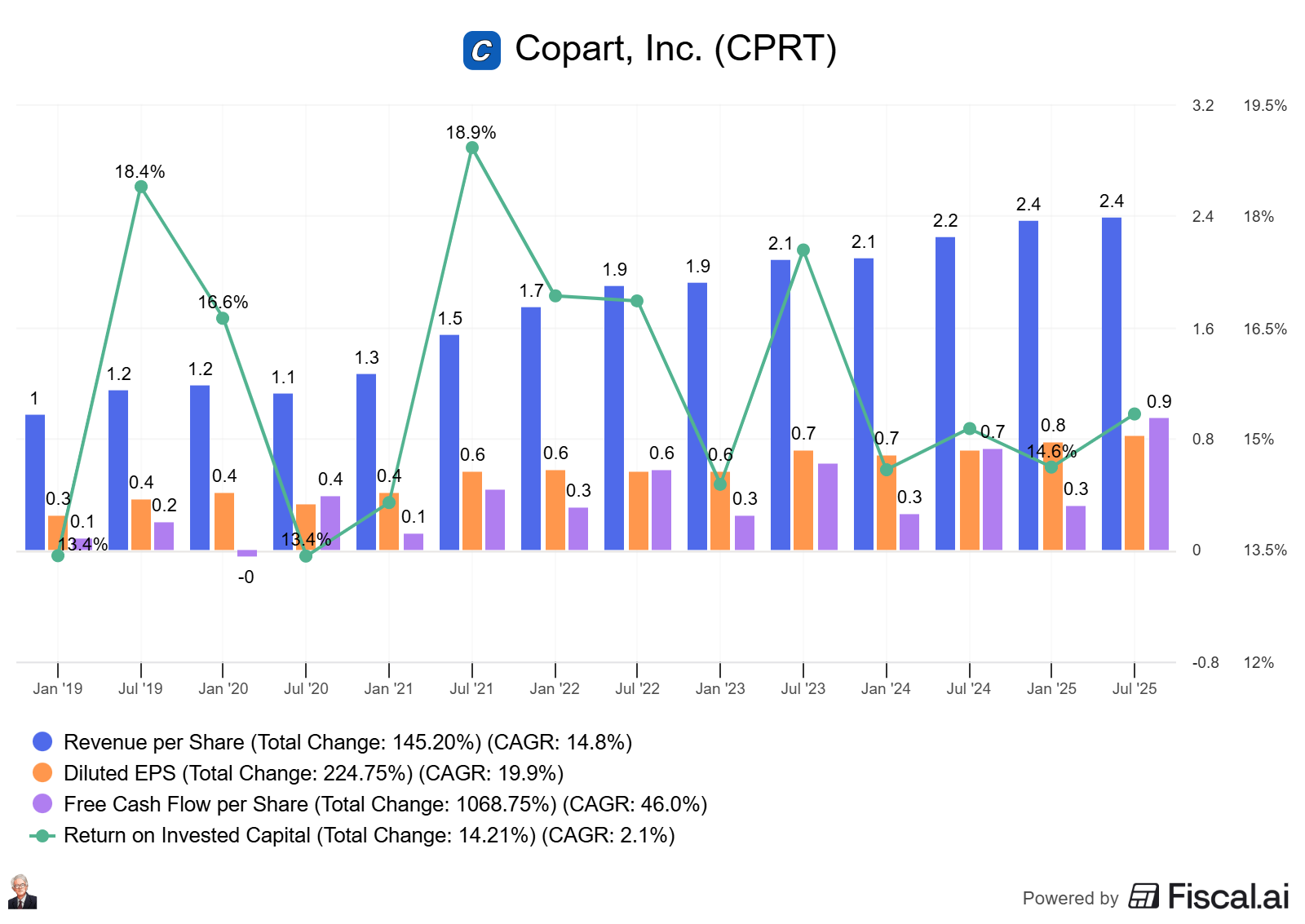 Copart (CPRT) is a dominant marketplace business sitting at the intersection of autos, insurance, and logistics. What appears to be a salvage auction company is in reality a high-margin, capital-light global platform with powerful network effects and exceptional capital returns.
