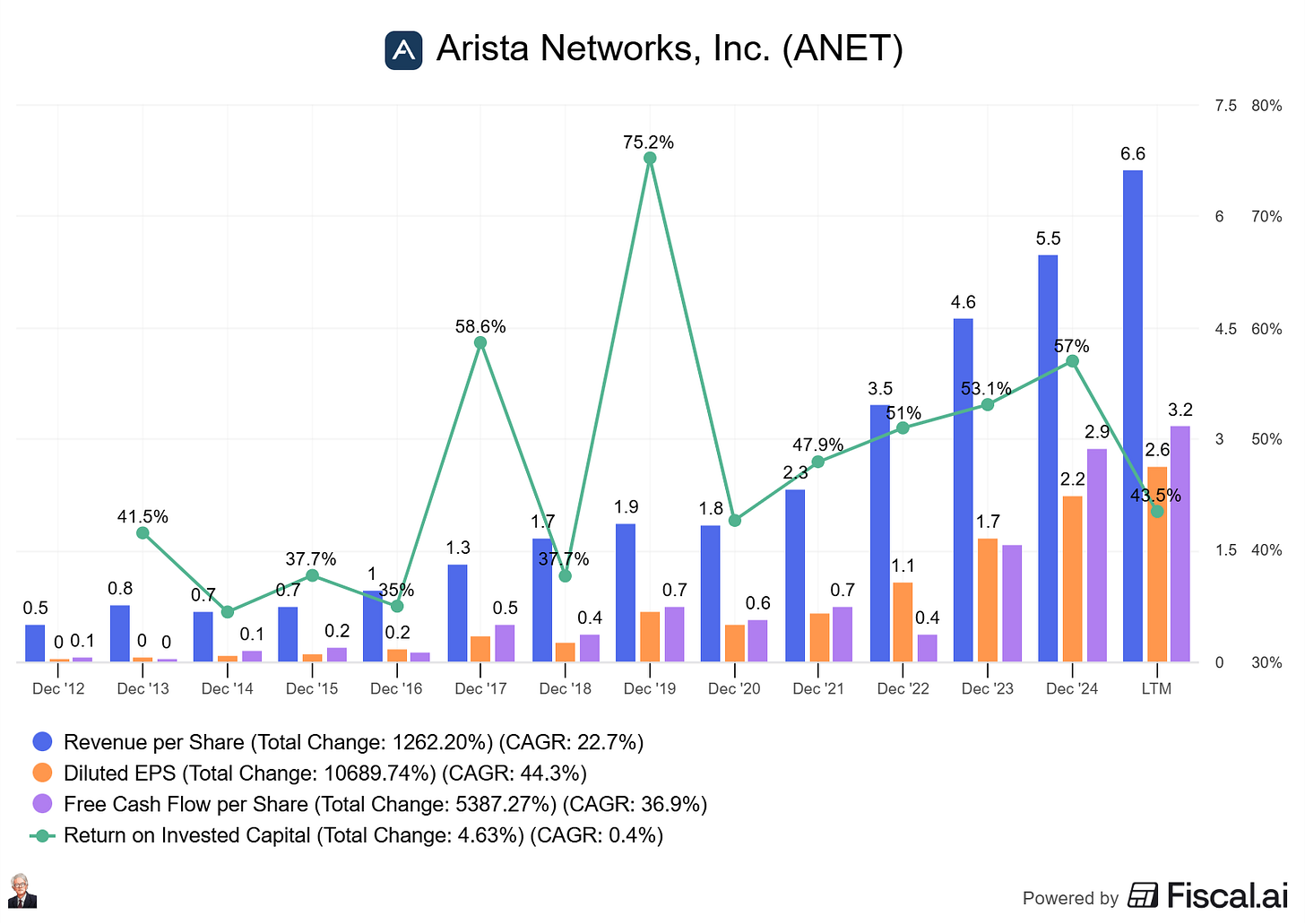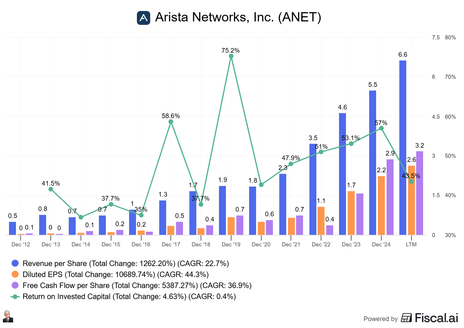 Arista has compounded revenue at a 22%+ CAGR over the past decade, driven by cloud data center adoption and market share gains from legacy incumbents. More recently, AI-driven networking demand has become a major incremental growth driver.