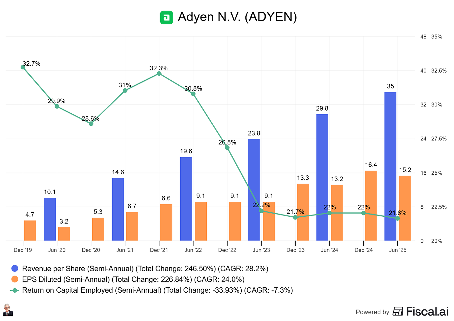 Adyen has compounded revenue at a mid-20%+ CAGR over the long term, driven by volume growth from existing merchants, new enterprise wins, and expanding use cases. Growth has recently normalized as e-commerce matured and comparisons became tougher.