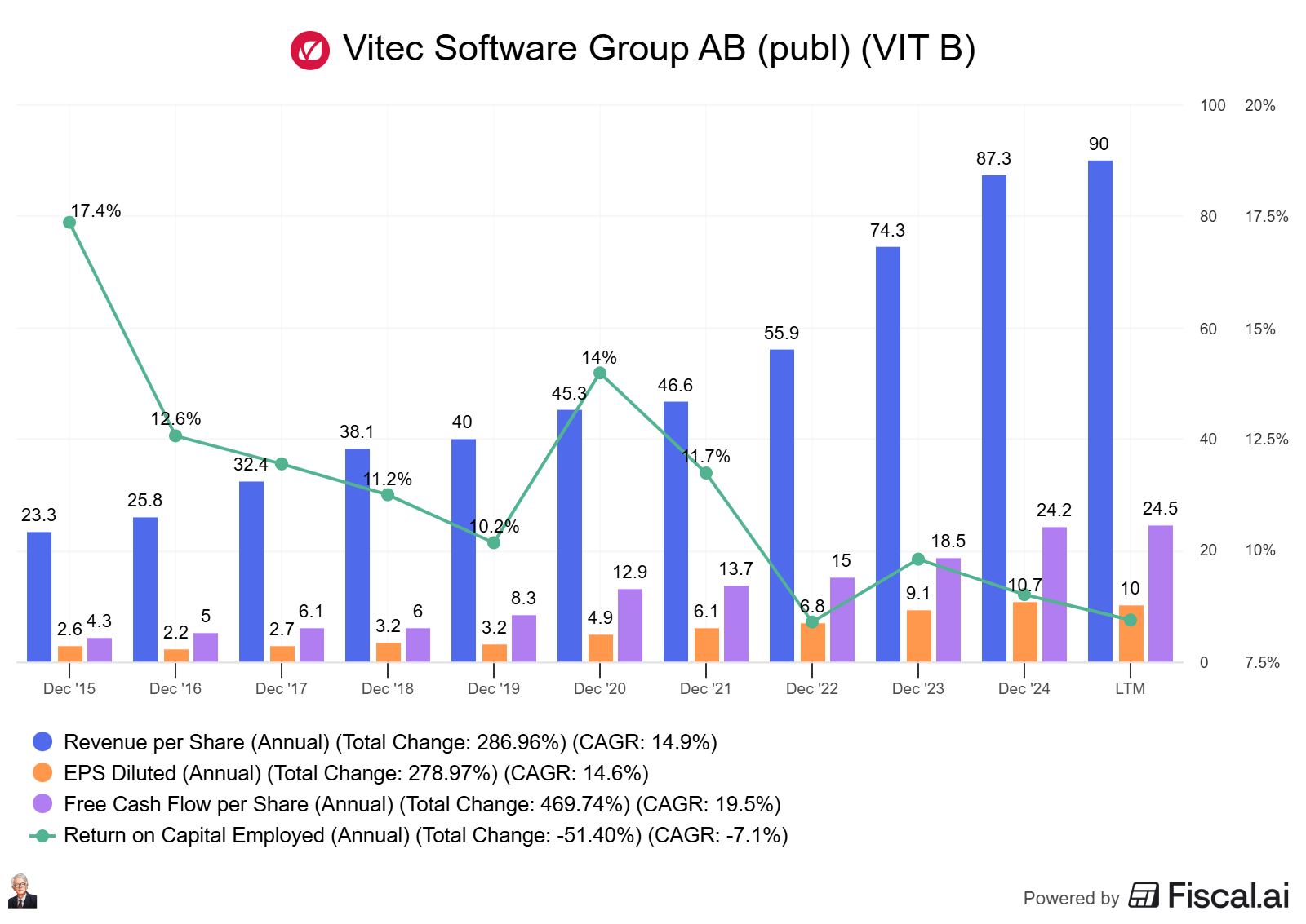 Vitec continues to compound with a high recurring revenue base and acquisition-driven scale. Recent results show strong revenue growth, a high recurring revenue mix, and healthy operating margins. On returns on capital, the business economics are strong, though reported ROIC can vary depending on how capitalized acquisitions are treated, the underlying cash returns from recurring revenue, and high margins are attractive.