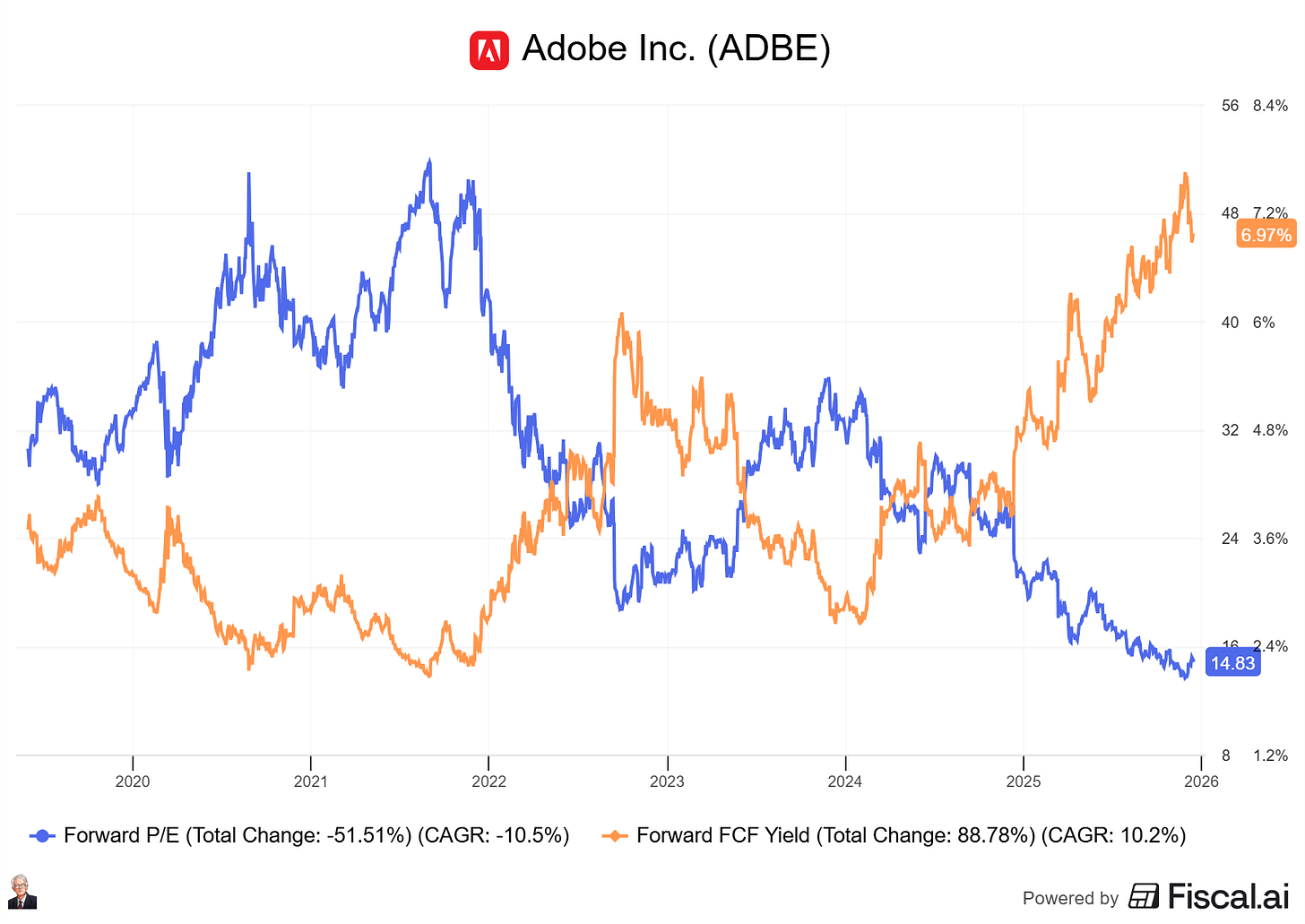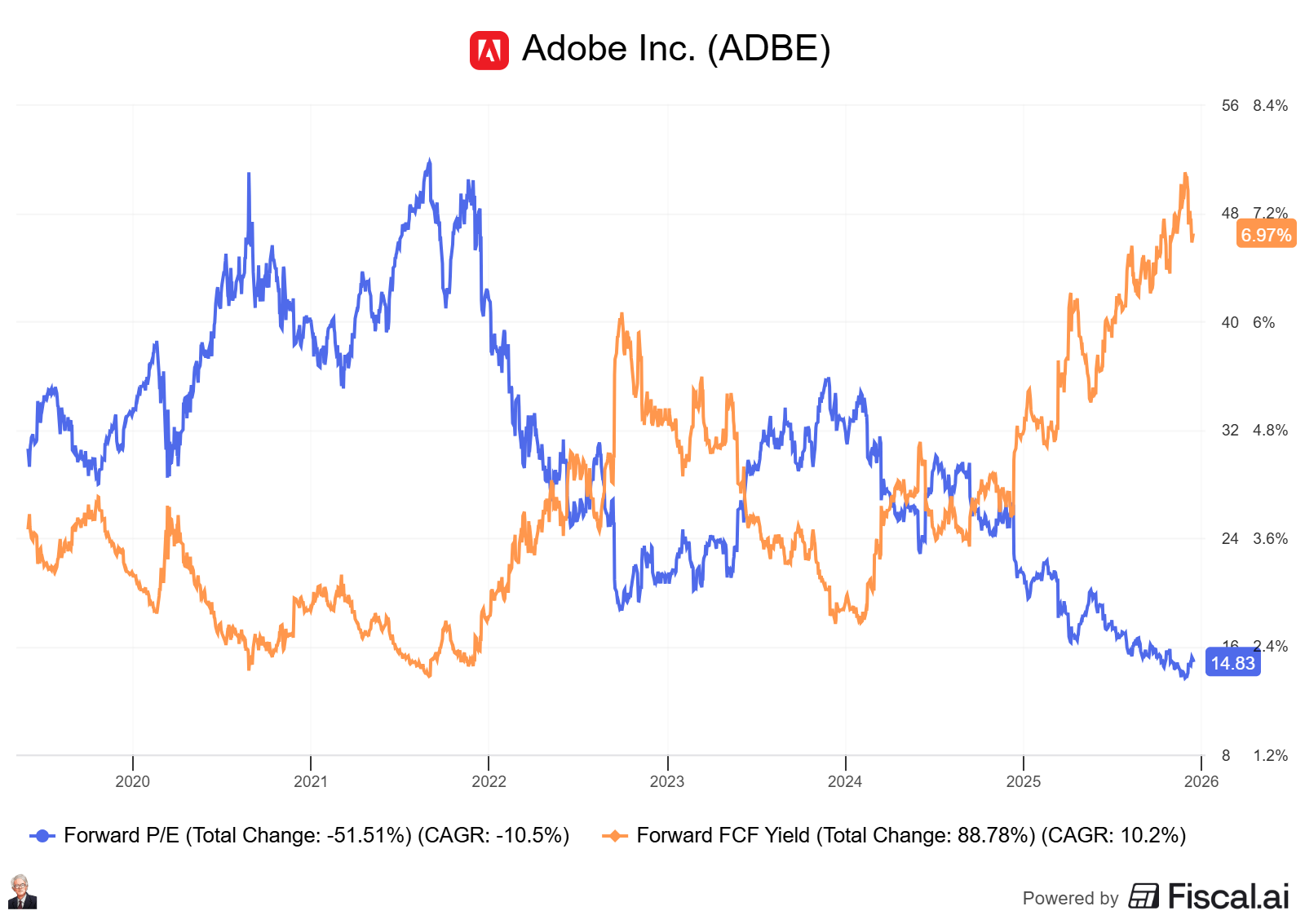 Adobe trades at approximately 14.8x forward earnings, way below its historical premium as the market weighs competitive and AI-related concerns. Free cash flow yield is ~7%, and valuation appears reasonable for a dominant software platform with durable growth and strong margins.