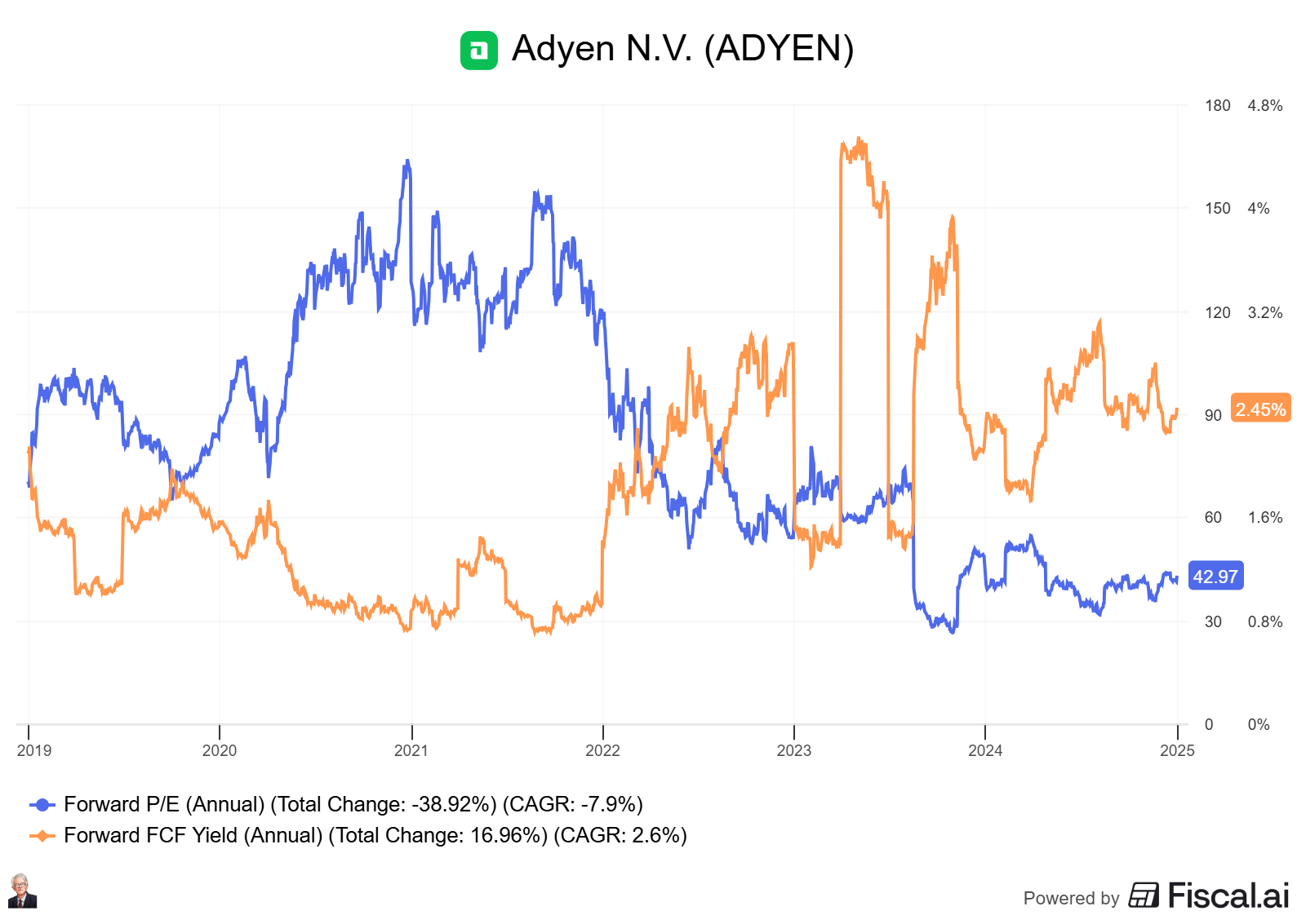 Forward FCF yield is currently 2.45%, a premium that is only justified if Adyen can continue its fast-growth projectory.