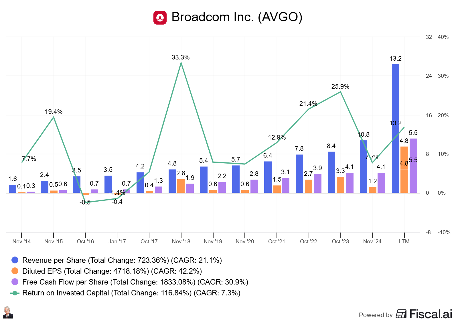 Broadcom (AVGO) is one of the most misunderstood mega-cap compounders in technology. What looks like a diversified semiconductor company is, in reality, a cash-generative infrastructure platform spanning custom silicon, connectivity, and mission-critical enterprise software.