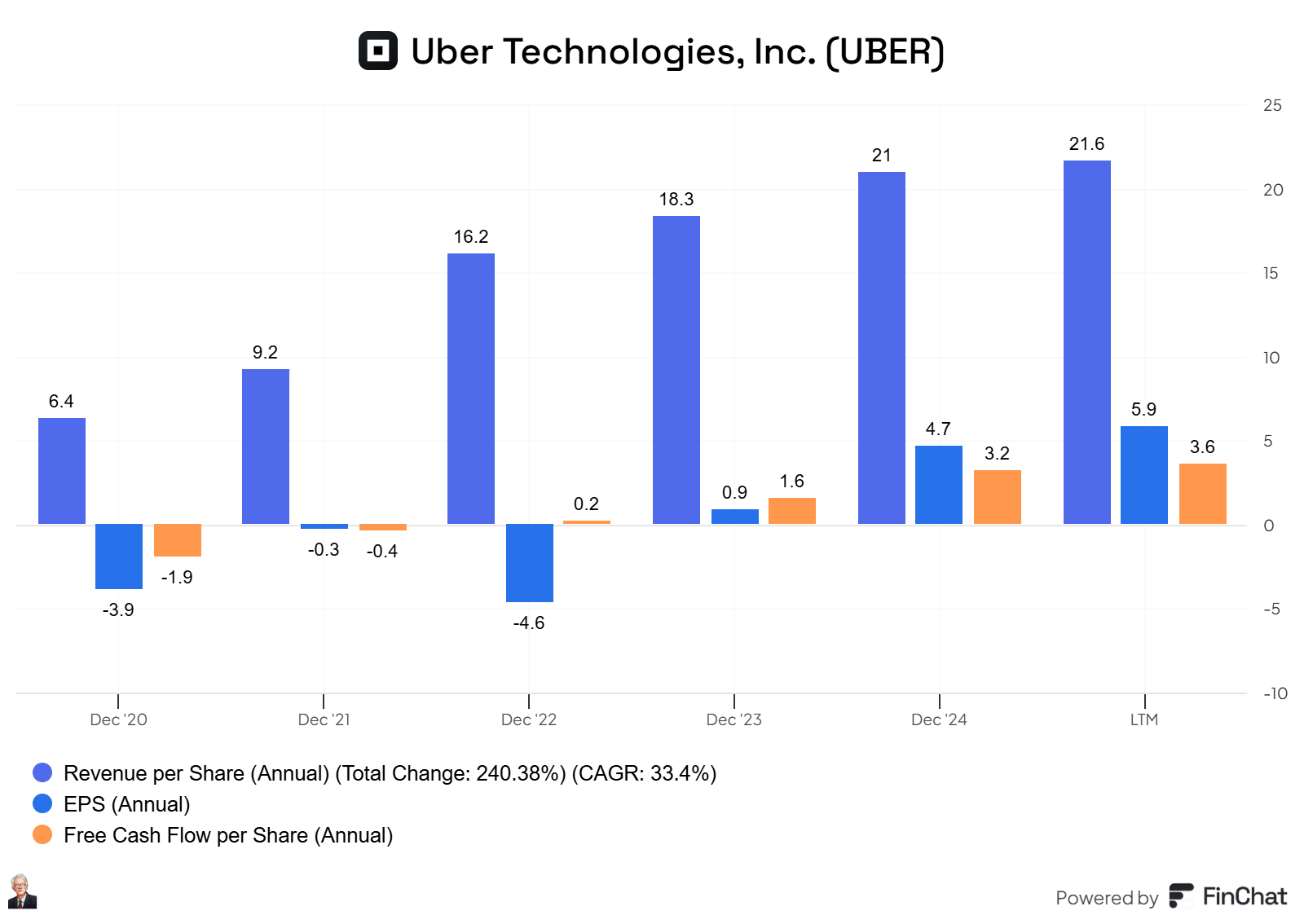 Since 2023, the profitability has increased a lotāin the last twelve months, Uber has delivered an EPS of $5.9, and a free cash flow per share of $3.6.