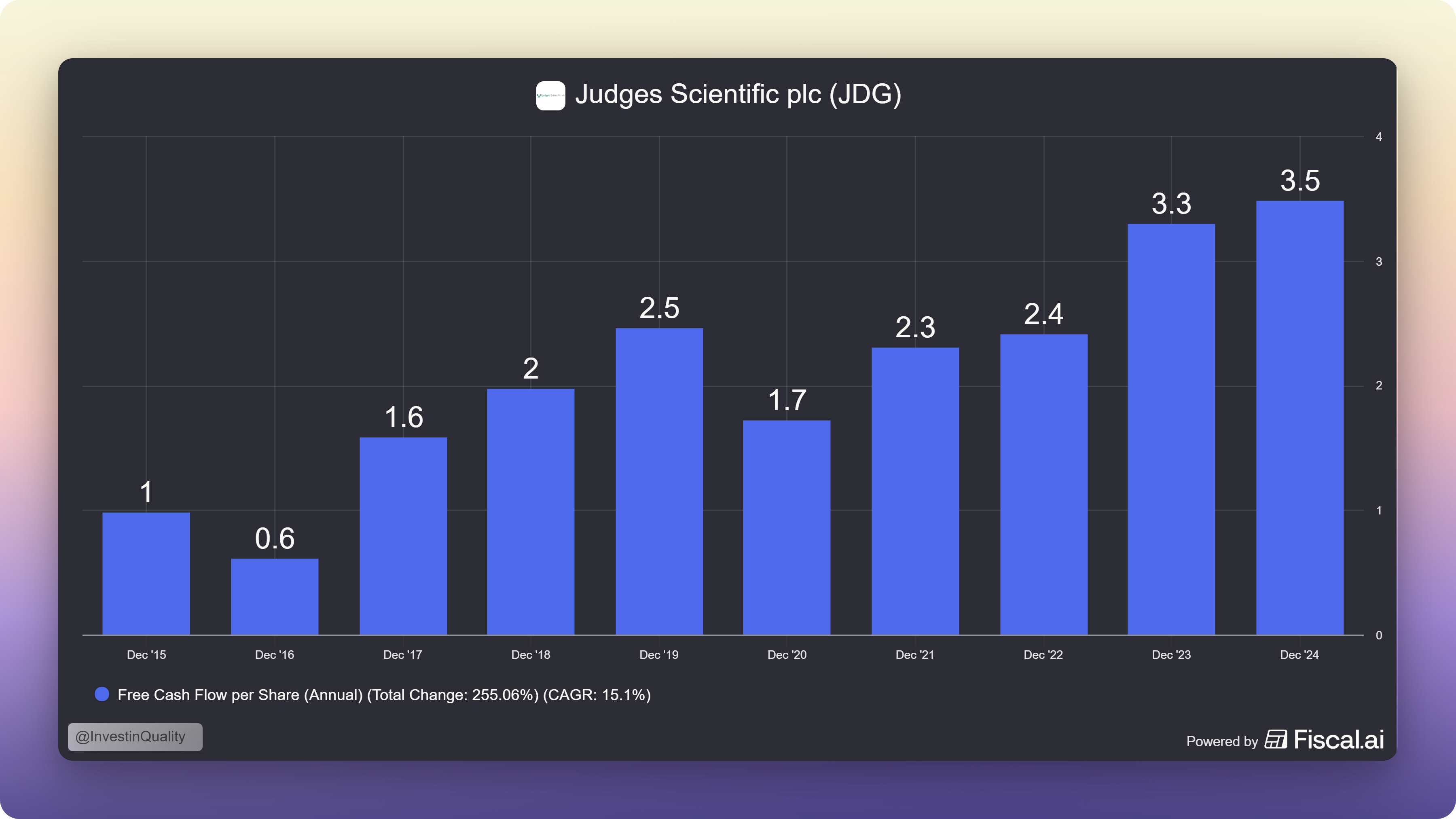 The niches are so small that a competitor entering one would face years of development cost to capture a market worth a few million pounds. The economics of competition do not work. So nobody competes. This has allowed Judges to compound its free cash flow per share by +15% annually over the last decade: