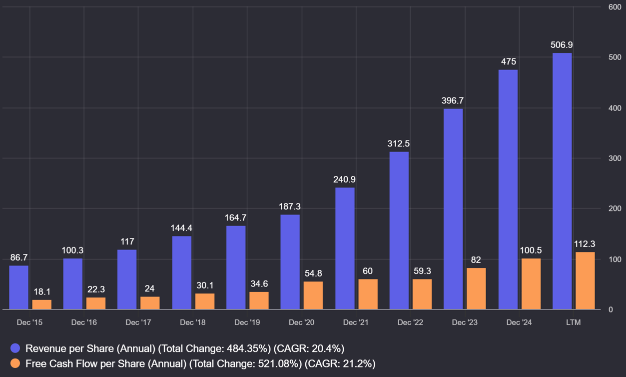 The business has compounded shareholder returns of 32.9% since its inception, and is a consistent compounder of free cash flow per share (21.2% CAGR since 2015):